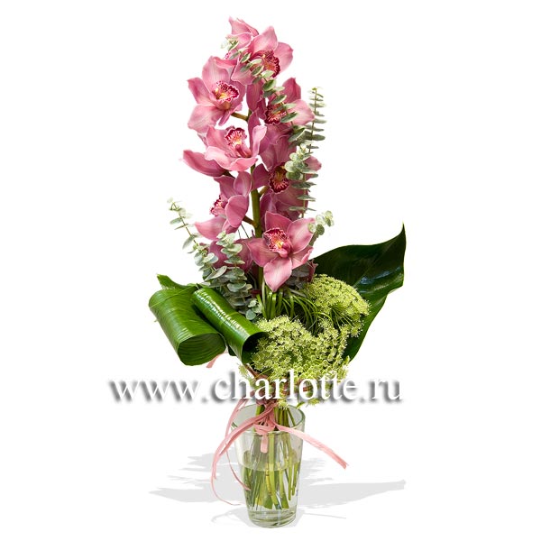 Букет вытянутой формы из розовой орхидеи, амми с декоративной зеленью. По Вашему желанию цветовую гамму юукета можно изменить, для этого звоните в наши салоны цветов или указывайте в разделе "комментарии для флориста" при заказе через интернет.