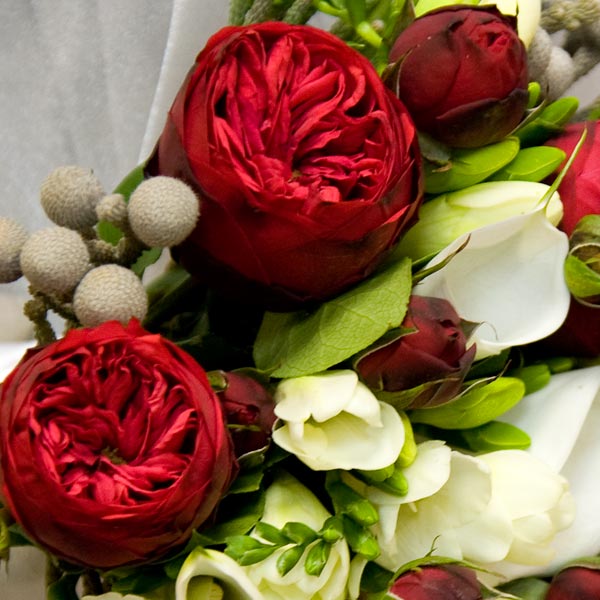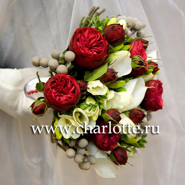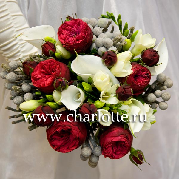 Букет невесты в красно-белых тонах их роз Пиано, белых фрезий, калл и брунии. По Вашему желанию цветовую гамму букета можно изменить, для этого звоните в наши салоны цветов или указывайте в разделе "комментарии для флориста" при заказе через интернет.