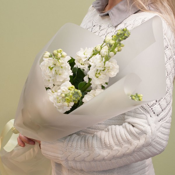 Небольшой букет из белой маттиолы в дизайнерской упаковке.
