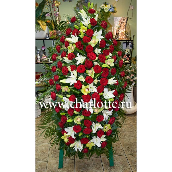 Состав: роза Гран При 90 шт, белая лилия восточная 15 шт, орхидея цимбидиум 15 шт, аспидистра 20, робелини 20 шт, папоротник 3 пачки, каркас. Размер такой композиции 180*70 см.