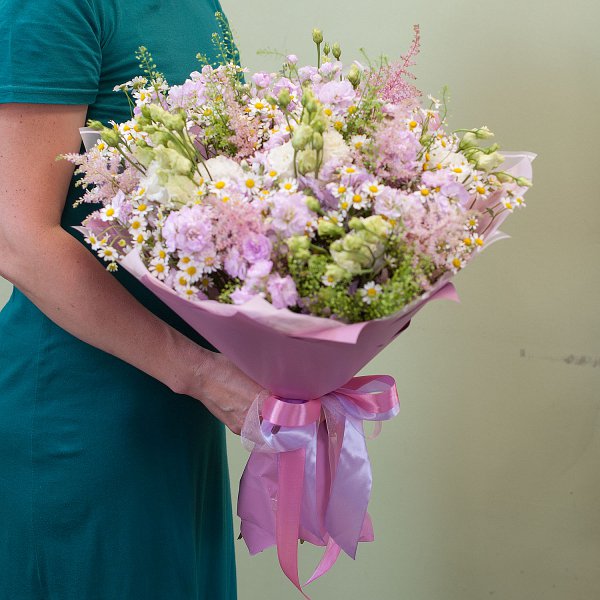 Букет выполнен в классическом стиле, что делает его актуальным и уместным для любого события. Элегантные и утонченные цветы, такие как розы, хризантемы, гвоздики и другие, создают неповторимый образ и придают букету особую изысканность.