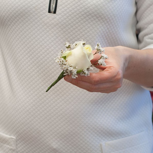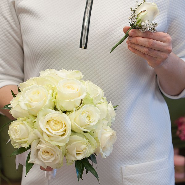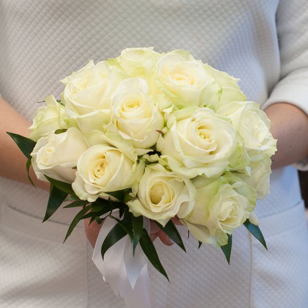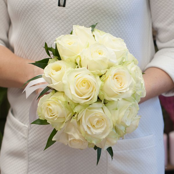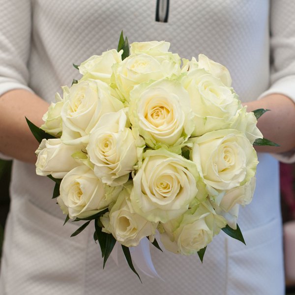 Букет невесты из белых роз на портбукетнице. К букету невесты рекомендуем заказать лепестки роз, а так же бутоньерку.