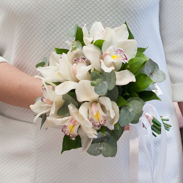 Букет невесты с "открытыми ножками" из белых орхидей с зеленью и лентами.