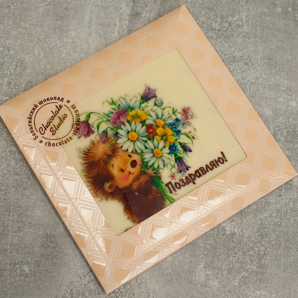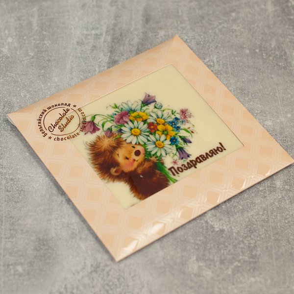 В одной упаковке содержится одна шоколадная открытка с изображением ежей и букетом "Поздравляю".