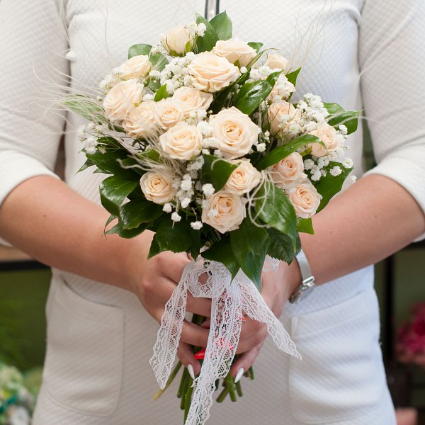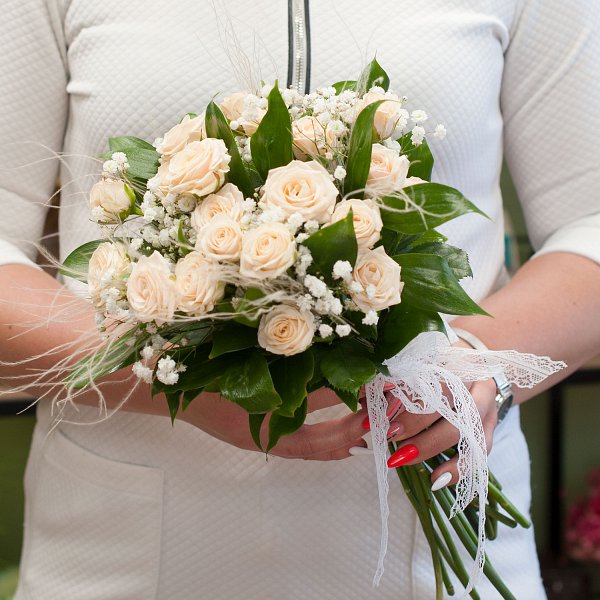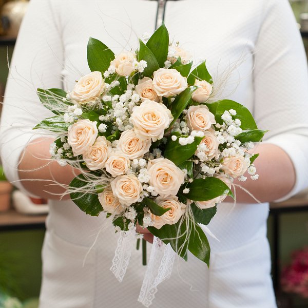 Букет невесты из кремовых кустовых роз, белой гипсофилы с декоративной зеленью и лентой.