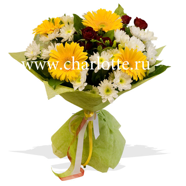 Букет в ярких тонах из роз, гербер, фрезий, хризантем. Цветы оформляются в подарочную упаковку на усмотрение нашего флориста.