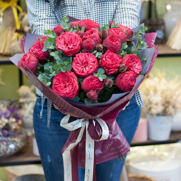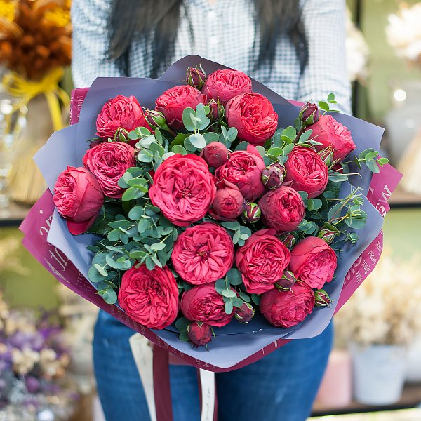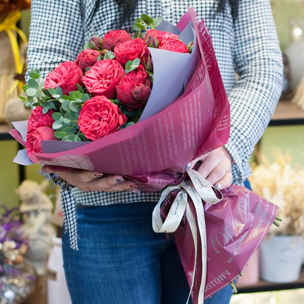Букет состоит из 17 пионовидных красных роз, которые придают ему неповторимый шарм и элегантность. Красные розы - символ любви и страсти, они всегда будут уместны и желанны.