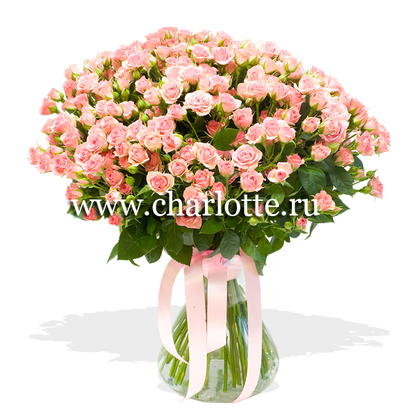 Букет из нежно-розовых кустовых роз перевязанный лентой.