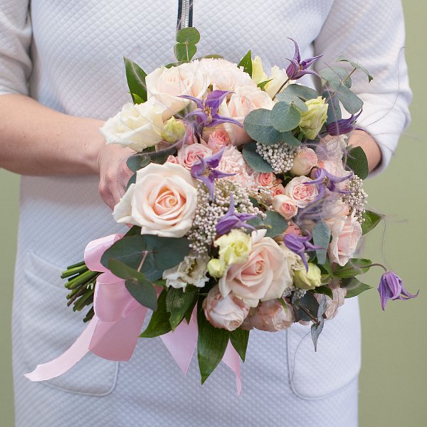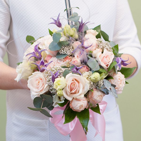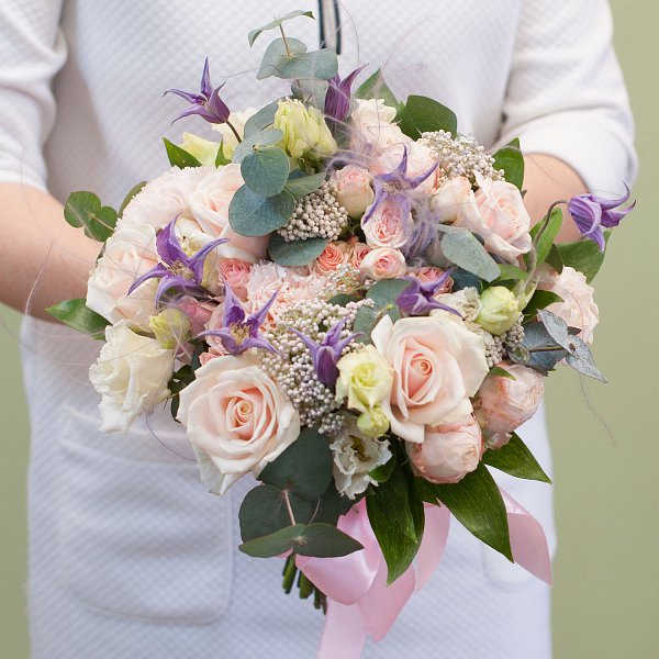 Букет невесты в нежной гамме из клематисов, кустовых роз, кустовых пионовидных роз, озатамнусов, гвоздик, лизиантусов, роз Талея с эвкалиптом и лентами.