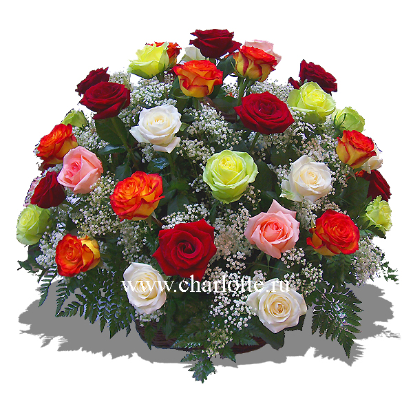 Корзинка их разноцветных роз, гипсофилы с декоративной зеленью.