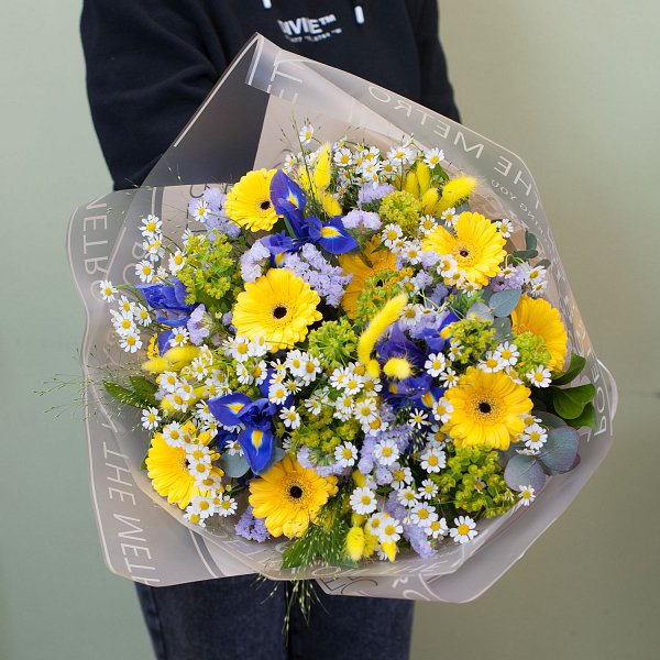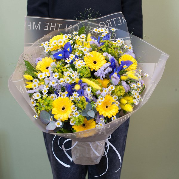 Букет из летних цветов: ромашек, ирисов, буплерума, гермини, паникума, - и других цветов и зелени в дизайнерской упаковке.