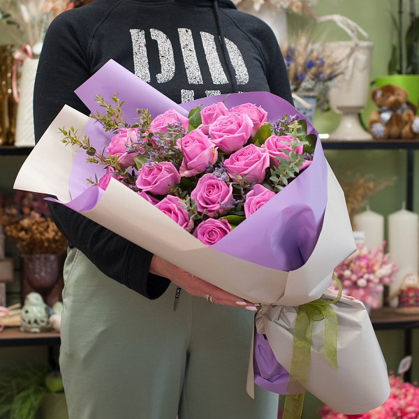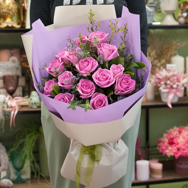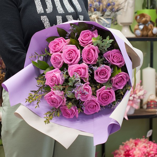 Букет из ярко-розовых роз с зеленью и лимониумом в подарочной упаковке.