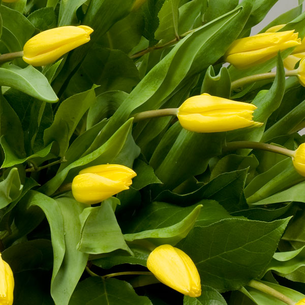 Корзинка из желтых тюльпанов с декоративной зеленью.