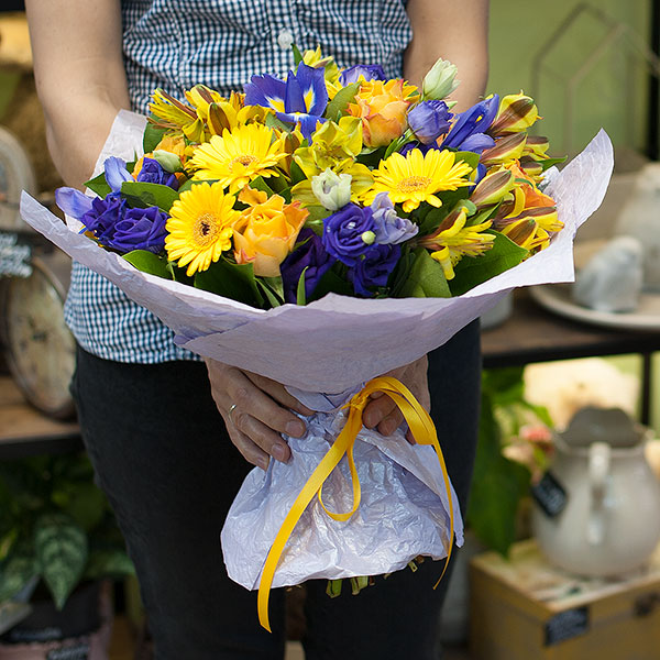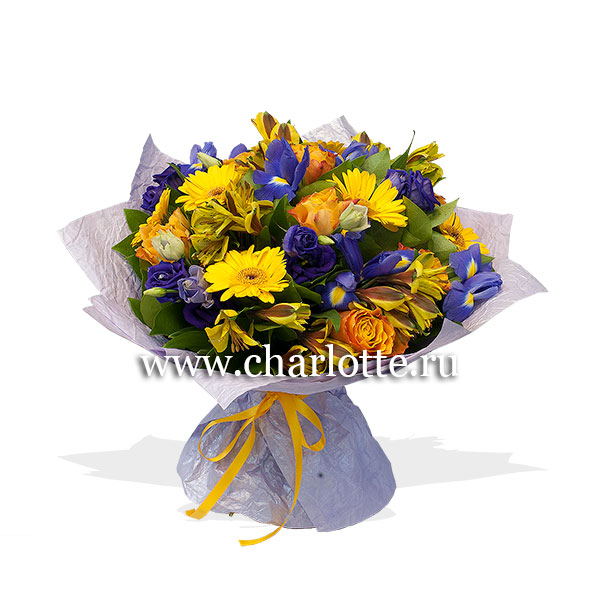 Букет в желто-синих тонах из гербер, ирисов, лизиантусов, роз, альстромерий с декоративной зезелью в подарочной упаковке. По Вашему желанию цветовую гамму букета можно изменить, для этого звоните в наши салоны цветов или указывайте в разделе "комментарии для флориста" при заказе через интернет.