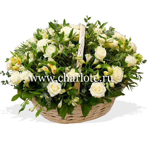 Корзина в белой гамме из роз и альстромерий с декоративной зеленью. По Вашему желанию цветовую гамму композиции можно изменить, для этого звоните в наши салоны цветов или указывайте в разделе "комментарии для флориста" при заказе через интернет.