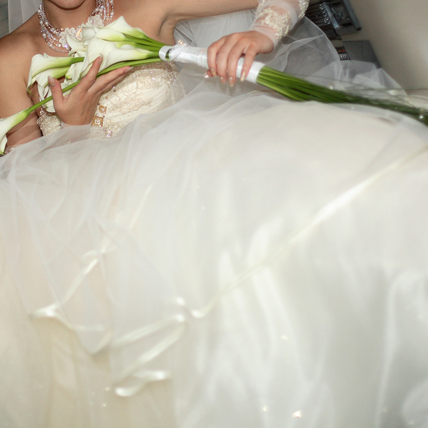 Элегантный букет невесты из белых мини калл с декоративной зеленью, украшенной жемчугом. По Вашему желанию цвет калл можно изменить, для этого размещайте заказы заранее, предварительно созвонившись с нашими операторами.