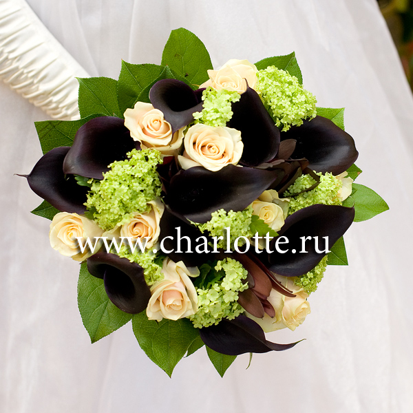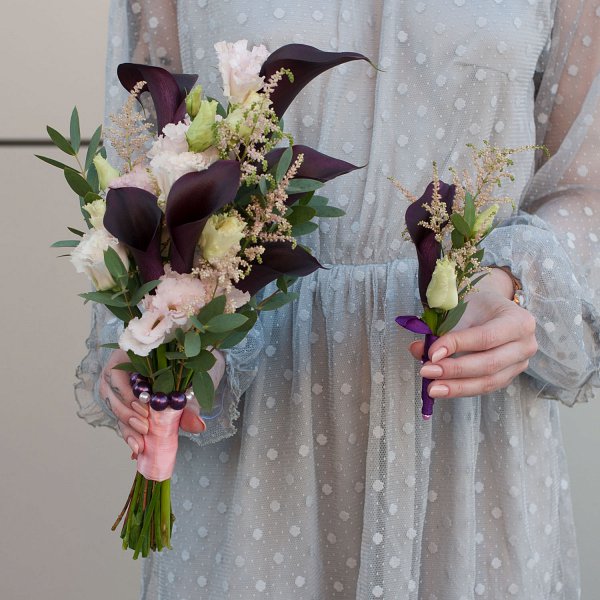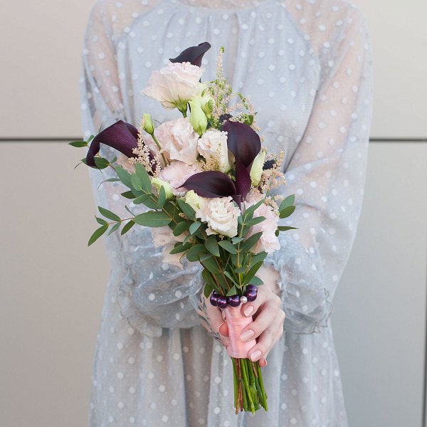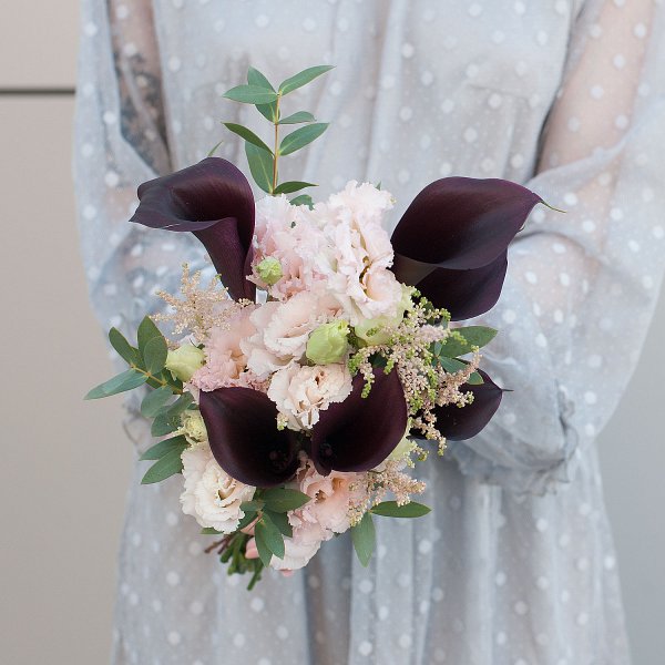 Букет состоит из 13 видов цветов, включая темные каллы, астильбу и эустому. Эти цветы придают букету глубину и насыщенность, делая его ярким и запоминающимся.