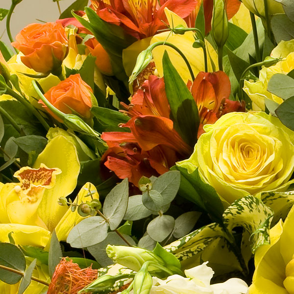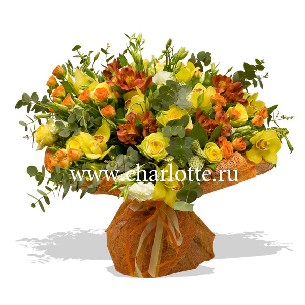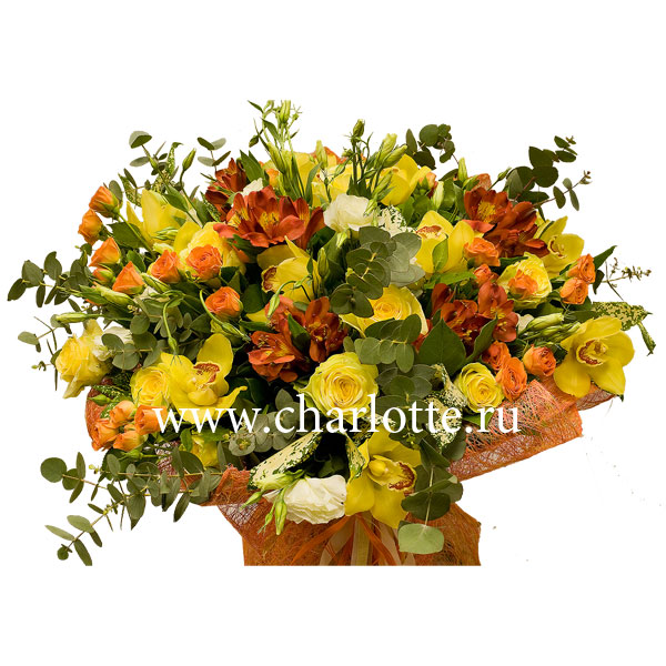 Букет собран из желтых одноголовых, оранжевых кустовых роз, альстромерий, лизиантусов, орхидей, а так же множества декоративной зелени.