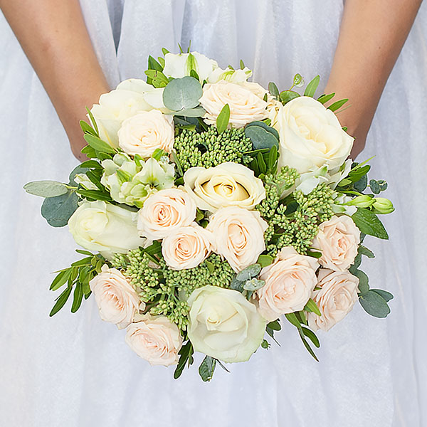 Букет невесты из белых роз, кремовых кустовых роз, белой альстромерии, седума, эвкалипта и писташи без порт букетницы с лентой. Доставляется по Москве и Санкт-Петербургу.