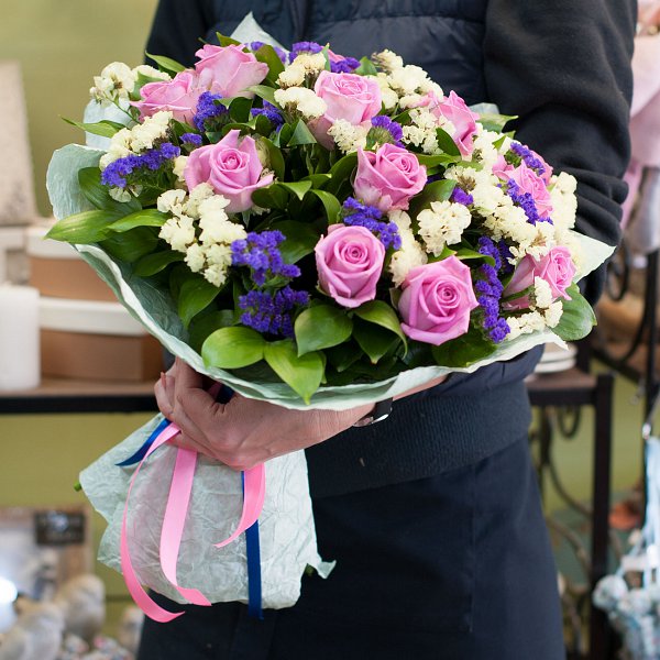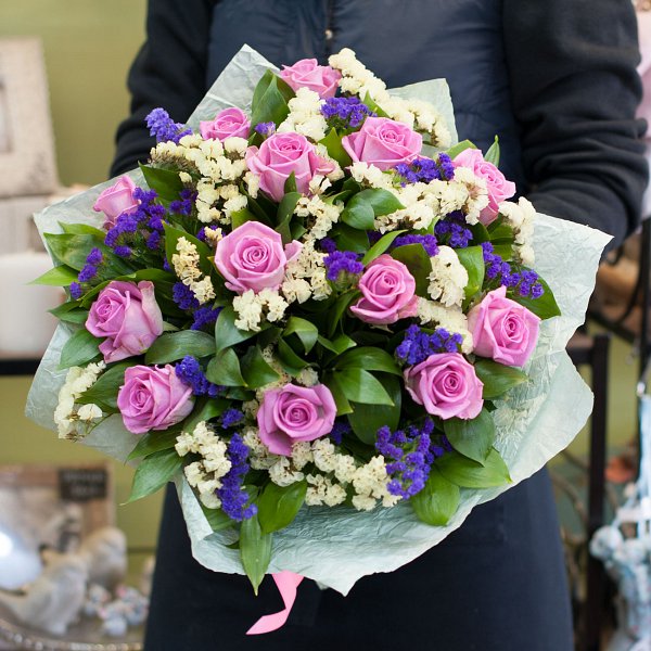 Букет состоит из роз Аква и разноцветной статицы, которые гармонично сочетаются с декоративной зеленью. Такая комбинация цветов создает неповторимый и яркий образ, который обязательно привлечет внимание.