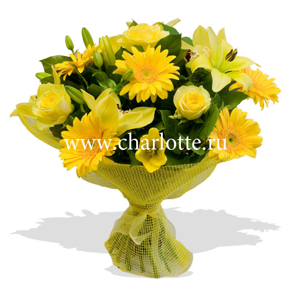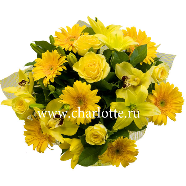 Букет цветов в желтых тонах из ро, гербер, орхидей цимбидиума, лилий с декоративной зеленью в подарочной упаковке. По Вашему желанию цветовую гамму букета можно изменить, для этого звоните в наши салоны цветов или указывайте в разделе "комментарии для флориста" при заказе через интернет.