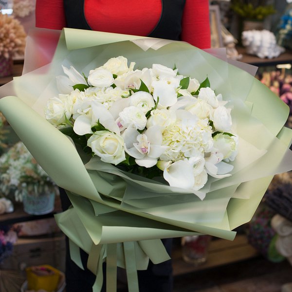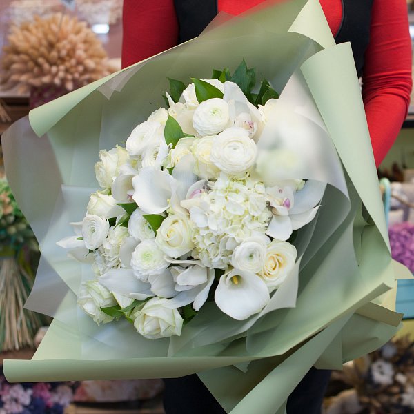 Букет выполнен в белых тонах, что придает ему элегантность и утонченность. В составе букета вы найдете гортензии, орхидеи, каллы, ранункулюсы и розы, которые гармонично сочетаются между собой. Декоративная зелень добавляет свежести и природной красоты.