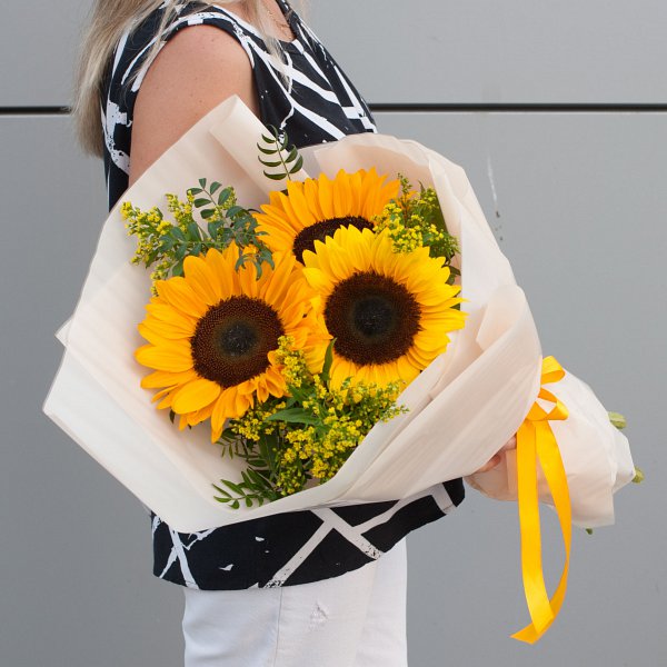 Букет "Лето Золотистое" - это сборный букет, состоящий из двух видов цветов: подсолнуха и солидаго. Эти яркие и солнечные цветы создадут атмосферу радости и тепла, а также подчеркнут вашу заботу и внимание к получателю.