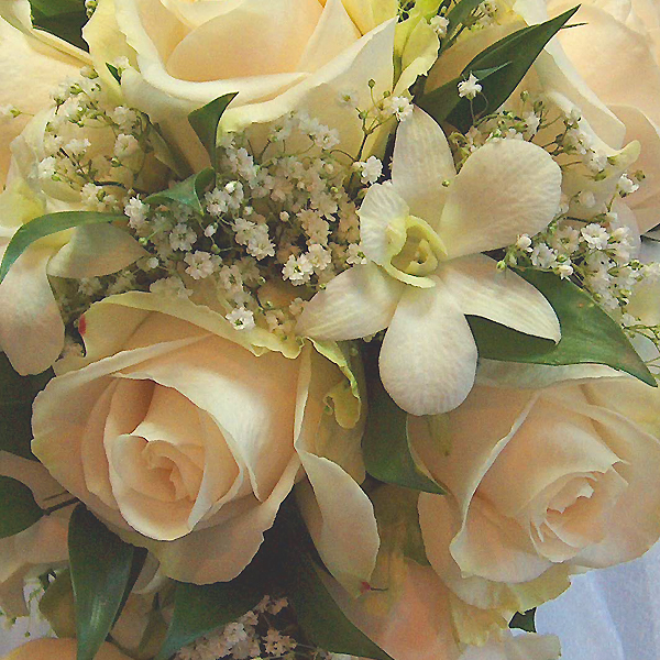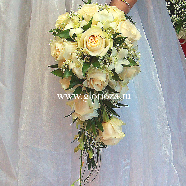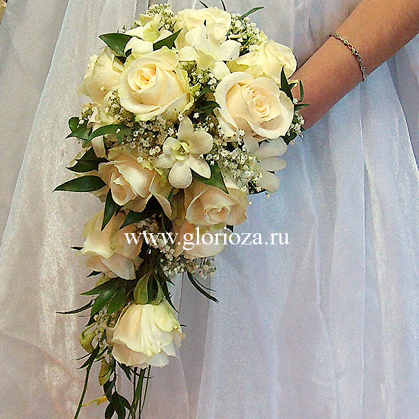 Букет невесты вытянутой формы из роз и орхидей. По Вашему желанию цвет роз и орхидей можно изменить, так же можно сделать этот букет классической круглой формы.