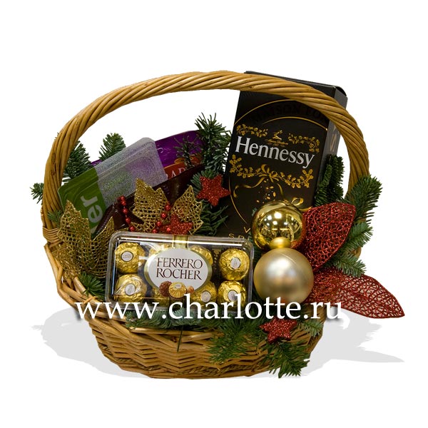 Подарочная новогодняя корзинка. По Вашему желанию состав корзинки можно изменить, для этого звоните в наши салоны цветов или указывайте в разделе "комментарии для флориста" при заказе через интернет.