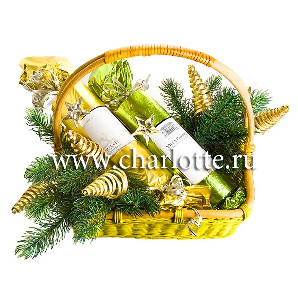 Новогодняя корзинка с еловым лапником и новогодним декором, с напитками 0,7 (красное и белое) в подарок. По Вашему желанию состав корзины можно изменить, для этого звоните в наши салоны цветов.
