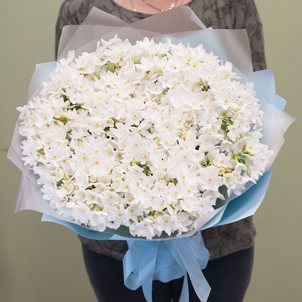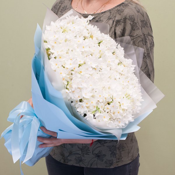 Букет из белых кустовых нарциссов с приятным ароматом в дизайнерской упаковке.
