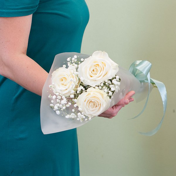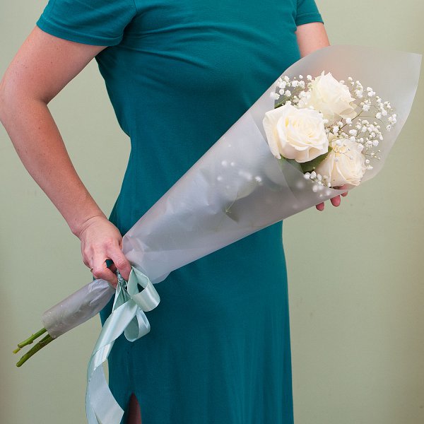 Букет состоит из двух видов цветов: розы и гипсофилы. Это создает уникальный и неповторимый образ, который будет радовать получателя своей красотой и свежестью.