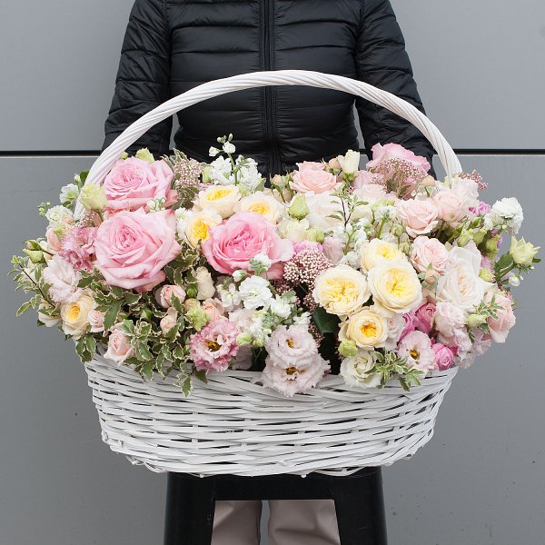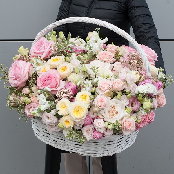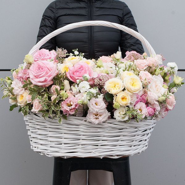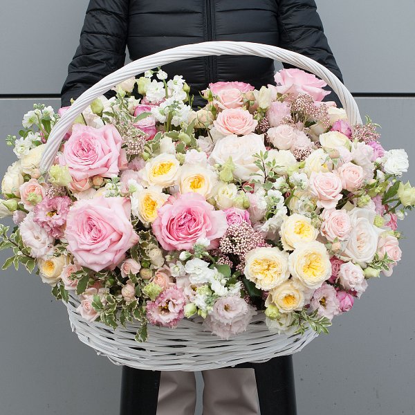 Корзина, в которую собраны цветы, выполнена из качественного материала, что гарантирует долговечность и сохранность букета.