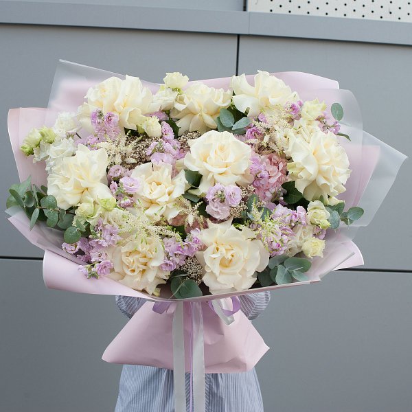 Букет состоит из 6 видов цветов: розы, маттиолы, гортензии, астильбы, лизиантуса и озатамнуса. Такое разнообразие цветов создает неповторимый и яркий образ, который обязательно запомнится.