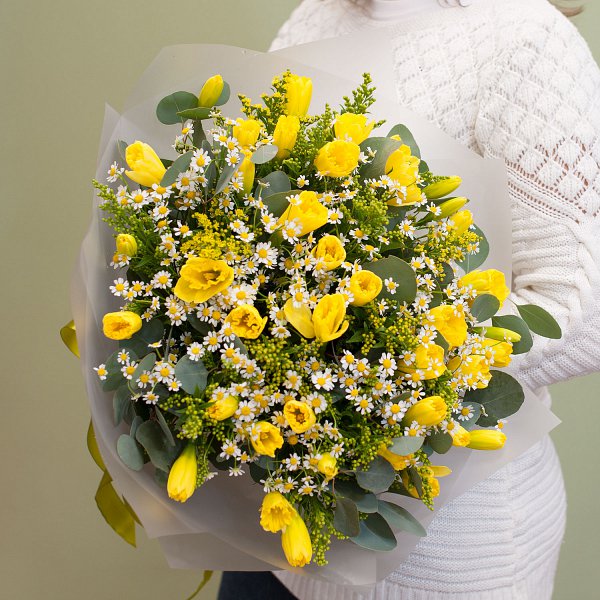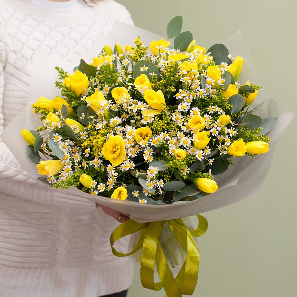 Букет цветов из желтых нарциссов, ромашки, золотистой солидаги с эвкалиптом в подарочной упаковке.