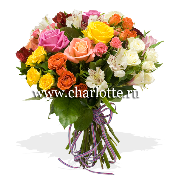 Букет из роз, кустовых роз, альстромерий с декоративной зеленью.По Вашему желанию цветовую гамму букета можно изменить, для этого звоните в наши салоны цветов или указывайте в разделе "комментарии для флориста" при заказе через интернет.