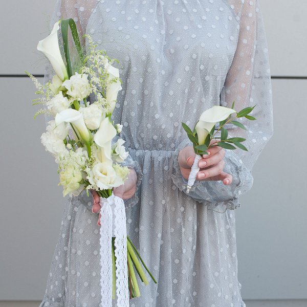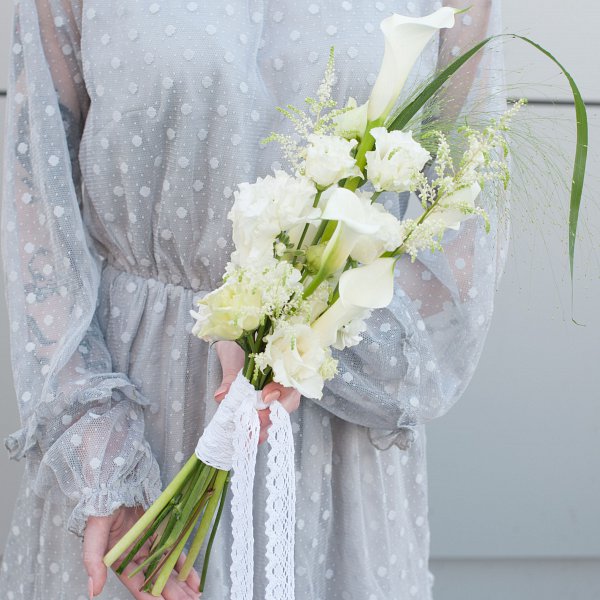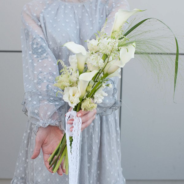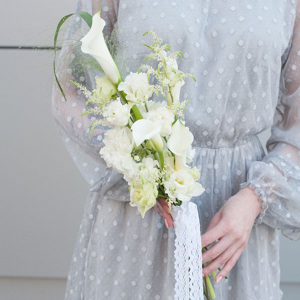 Букет состоит из 11 видов цветов, включая каллы, астильбу, маттиолу, лизиантусы и паникум. Такое разнообразие цветов создает неповторимый и яркий образ, который будет радовать вас и ваших гостей.