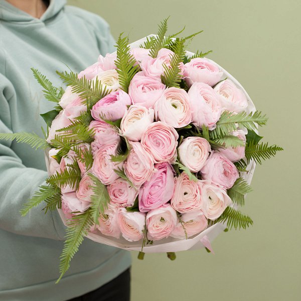 Букет состоит из 37 розовых ранункулусов, которые придают ему неповторимый и свежий вид. Ранункулюсы - это цветы, которые известны своей стойкостью и долгим сохранением свежести.