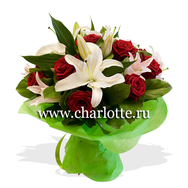 Букет из белых лилий, красных роз с декоративной зеленью в упаковке. По Вашему желанию цветовую гамму букета можно изменить, для этого звоните в наши салоны цветов или указывайте в разделе "комментарии для флориста" при заказе через интернет.