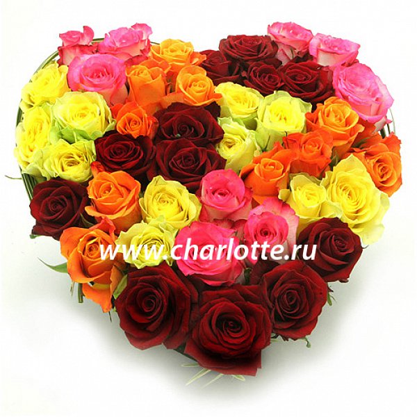 Сердце из разноцветных роз. По Вашему желанию цветовую гамму композиции можно изменить, для этого звоните в наши салоны цветов или указывайте в разделе "комментарии для флориста" при заказе через интернет. Вы можете заказать любое количество роз.