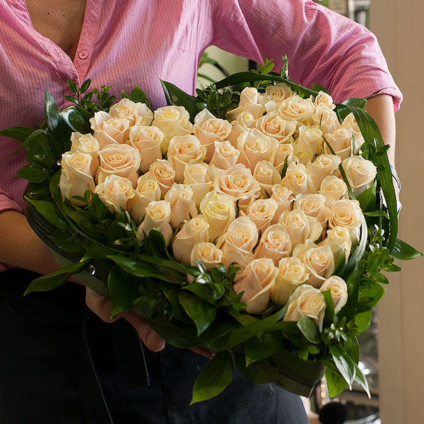 Сердце из кремовых роз с декоративной зеленью на флористическом оазисе. По Вашему желанию цветовую гамму композиции можно изменить, для этого звоните в наши салоны цветов или указывайте в разделе "комментарии для флориста" при заказе через интернет.