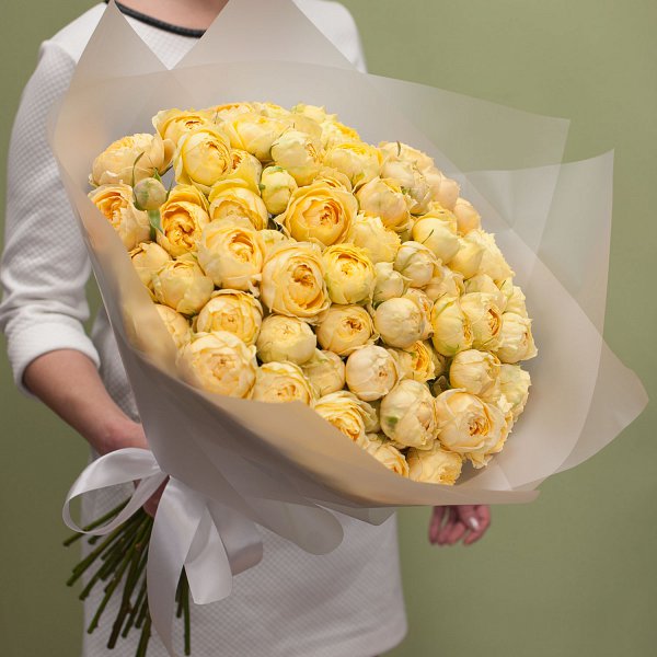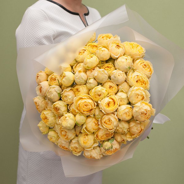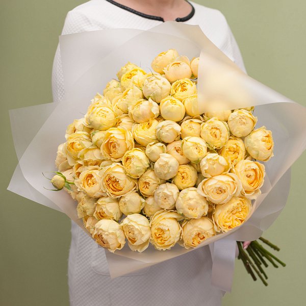 Букет из пионовидных кустовых желтых роз в дизайнерской упаковке.