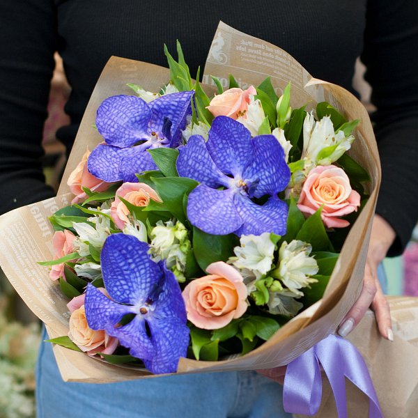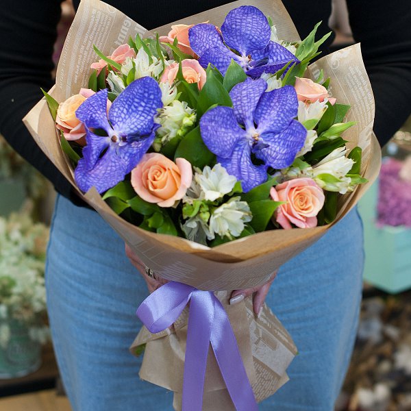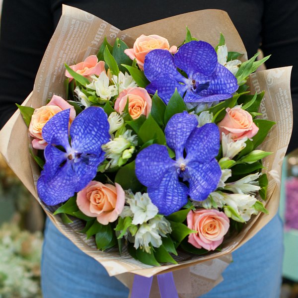 Букет цветов из синих орхидей сорта Ванда, персиковых роз сорта Мисс Пиги, белой альстромерии с декоративной зеленью в подарочной упаковке.