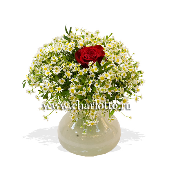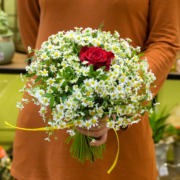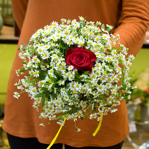Букет из мелкой ромашки и одной розы Гран При. По Вашему желанию цвет розы может быть любой, для этого звоните в наши салоны цветов или указывайте в разделе "комментарии для флориста" при заказе через интернет.