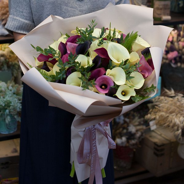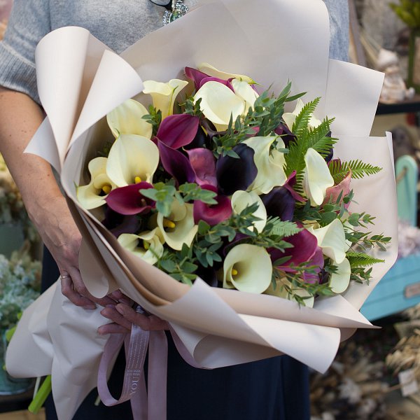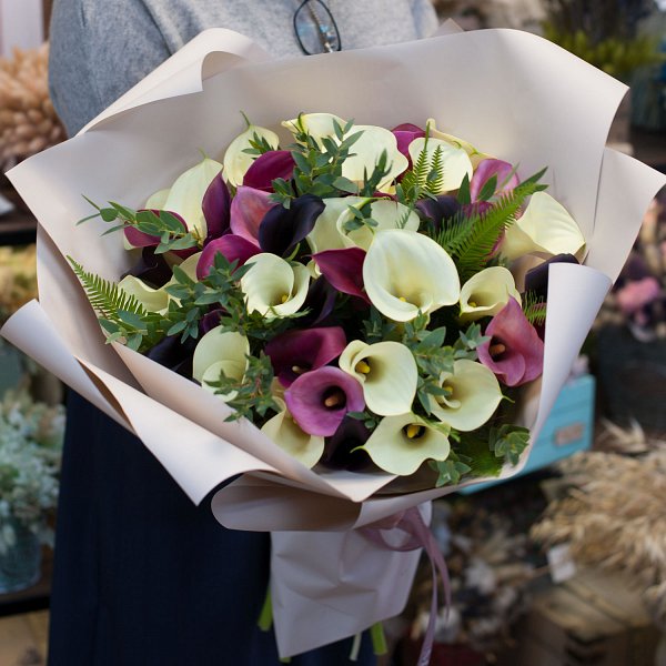 Букет из белых, розовых и темных калл с декоративной зеленью в подарочной упаковке.