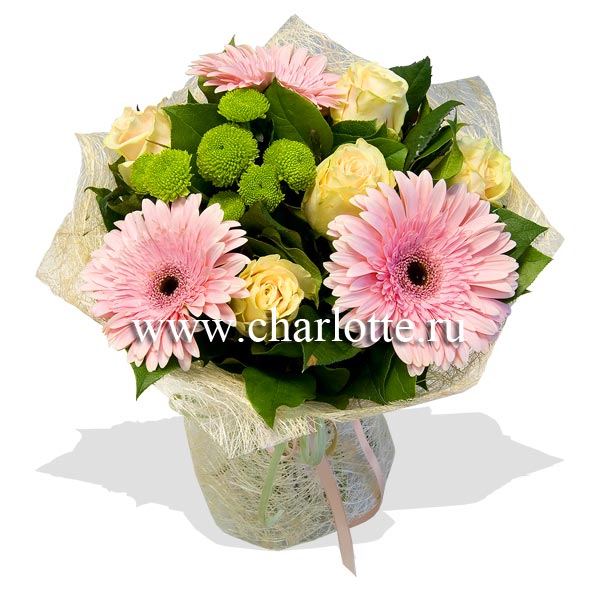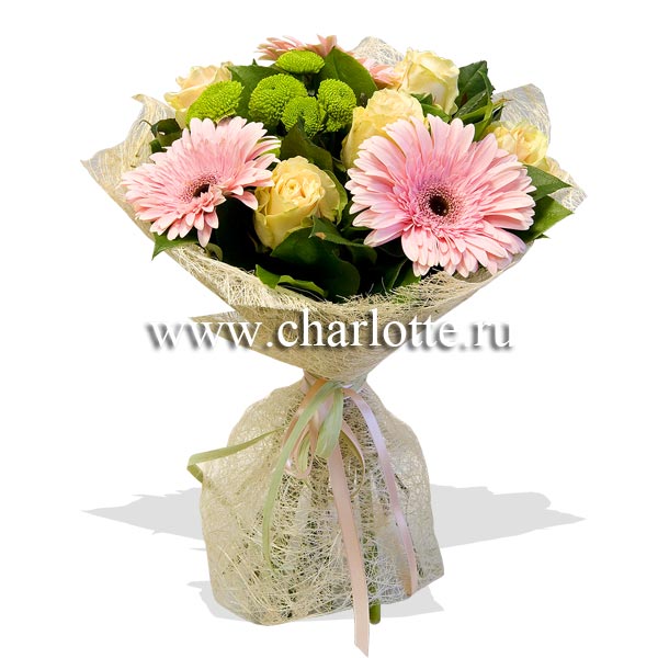 Букет в нежных тонах из роз, гербер хризантем с декоративной зеленью. Цветы оформляются в подарочную упаковку на усмотрение нашего флориста. По Вашему желанию цветовую гамму букета можно изменить, для этого звоните в наши салоны цветов или указывайте в разделе "комментарии для флориста" при заказе через интернет.