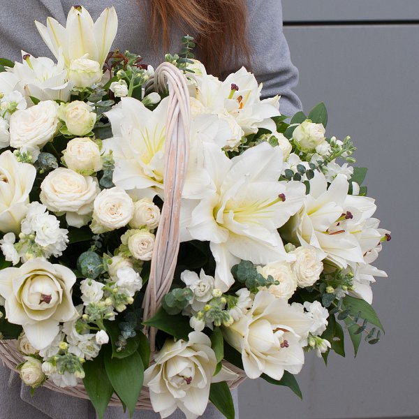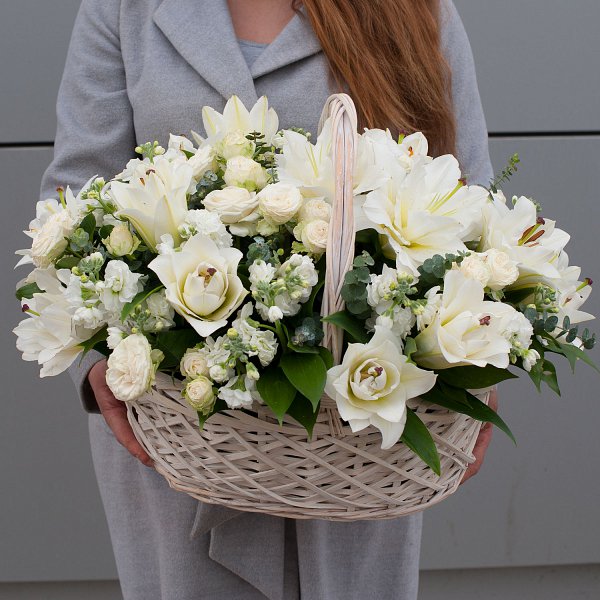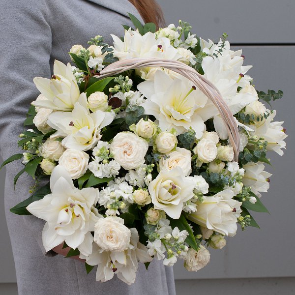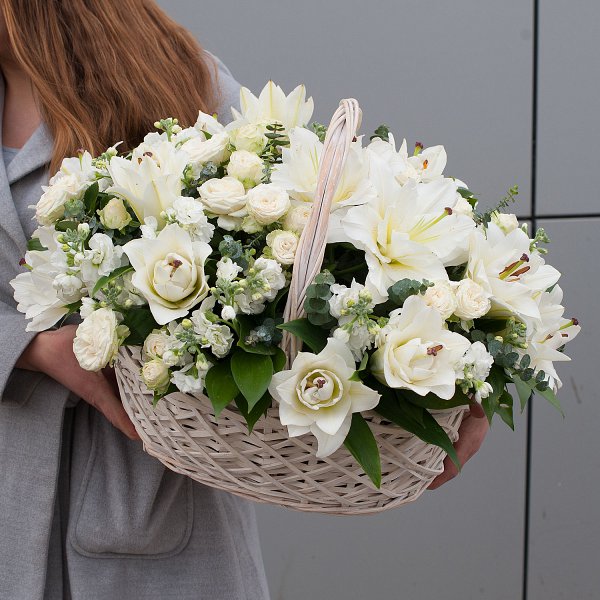 Корзина в белых тонах из восточных лилий, роз и маттиолы "Монако" - это изысканный и стильный подарок, который подойдет для любого повода и станет прекрасным дополнением к любому торжеству.