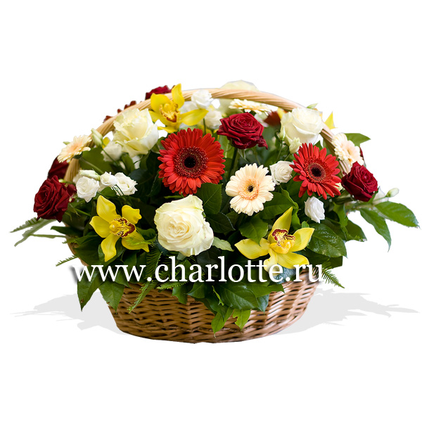 Корзина в разноцветных тонах из роз, орхидей, гербер, лизиантусов с декоративной зеленью в корзине. По Вашему желанию, цветовую гамму корзины можно изменить, для этого звоните в наши салоны цветов или указывайте в разделе "комментарии для флориста" при заказе через интернет".