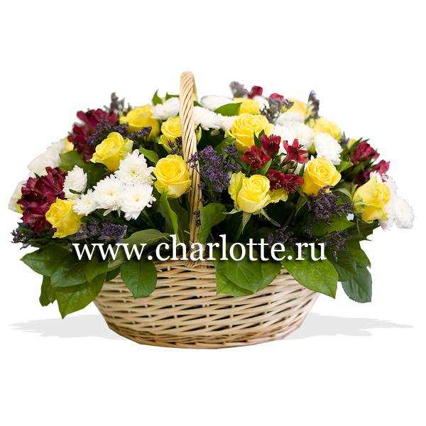 Корзина из желтых роз, белой хризантемы, лимониума, красной альстромерии с декоративной зеленью. По Вашему желанию цветовую гамму корзины можно изменить, для этого звоните в наши салоны цветов или указывайте в разделе "комментарии для флориста" при заказе через интернет.