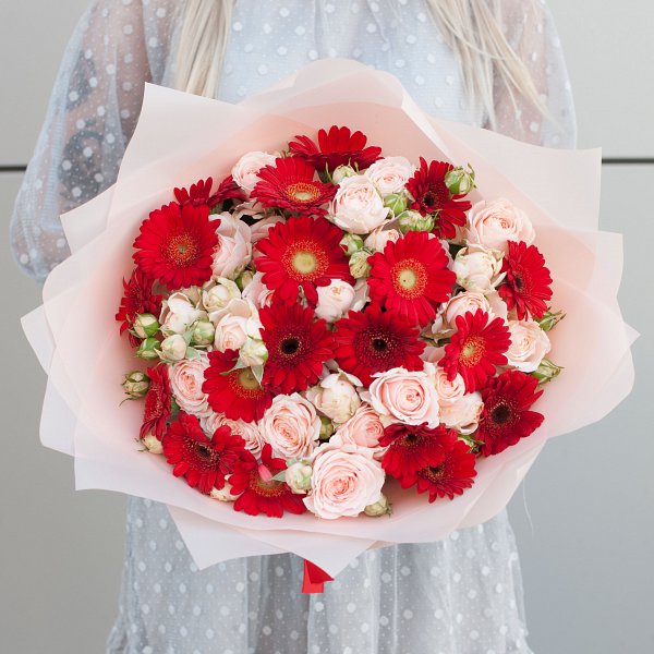 Букет состоит из 29 цветов, включая 19 минигербер красного цвета и 10 кустовых роз бежевого оттенка.